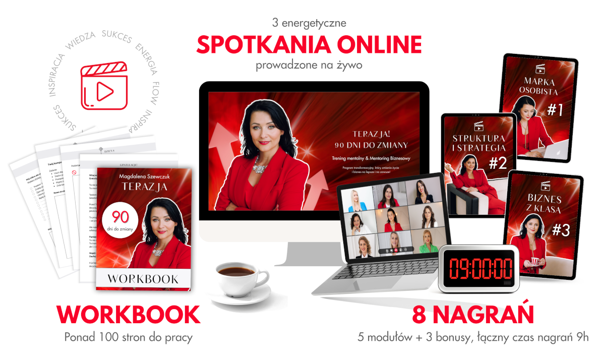 90 dni do zmiany – przełomowy program mentalno-biznesowy dla kobiet, które chcą wyrwać się z impasu, pokonać wewnętrzne blokady i w końcu z pełną mocą zacząć budować życie i biznes na własnych zasadach. - Dostęp do Przestrzeni Mocy na Telegramie – 12 miesięcy